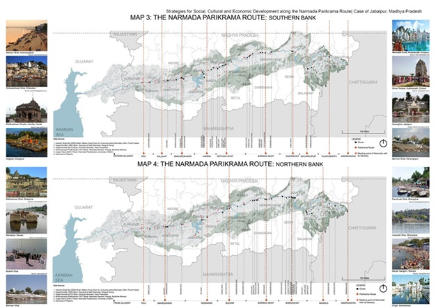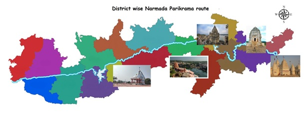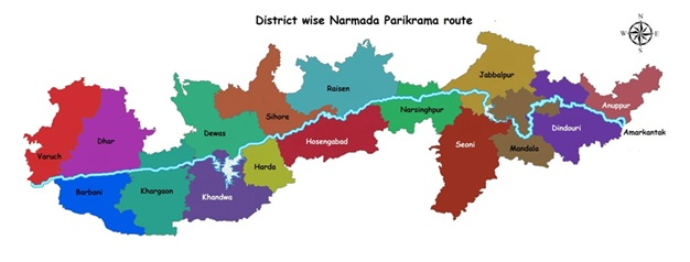 - The Narmada parikrama is a difficult spiritual exercise involving a 2,600-kilometer journey. The journey usually begins at the river’s source (Udgama) in Amarkantak in the Maikal Hills of Madhya Pradesh and continues along its southern banks (Dakshin tat) to its mouth in Bharuch in Gujarat. The Narmada River meets the Arabian Sea at Bharuch’s Mithi Talai. Pilgrims must take a motorboat from the southern to the northern end of the river to begin their journey back along its northern bank (uttar tat).